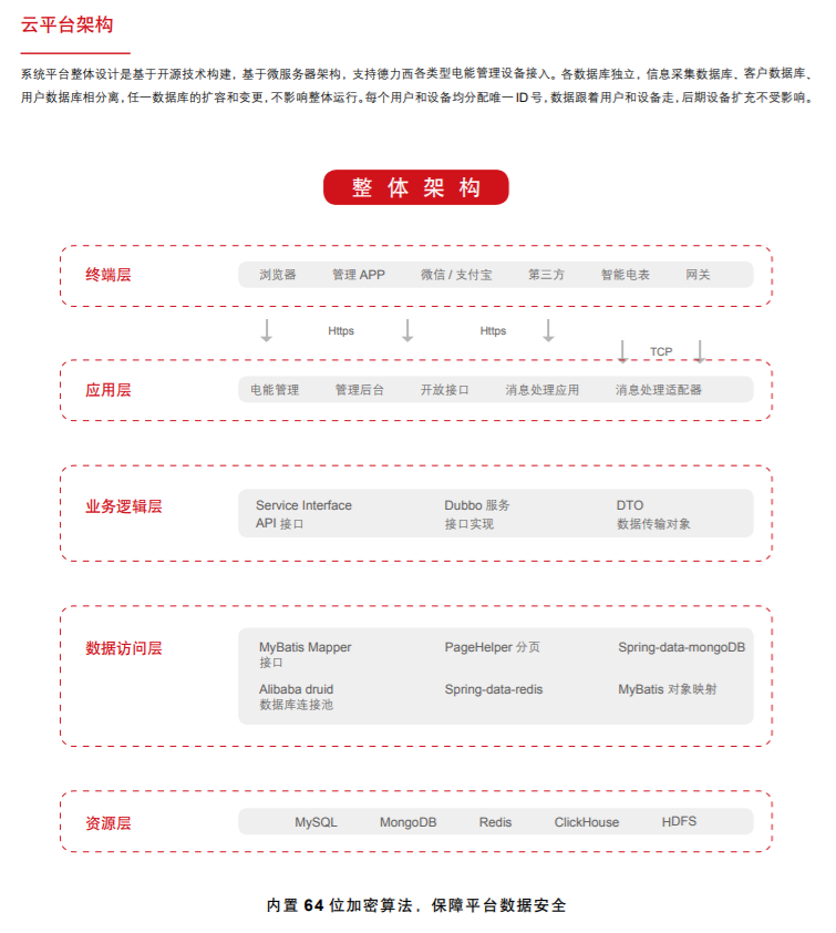 德力西電氣云平臺(tái)電能管理系統(tǒng)可以實(shí)現(xiàn)用戶電費(fèi)遠(yuǎn)程支付及自動(dòng)抄表管理,實(shí)現(xiàn)電能表遠(yuǎn)程自動(dòng)抄表、預(yù)付費(fèi)或后付費(fèi)、統(tǒng)計(jì)及分析功能。本系統(tǒng)采用云服務(wù)器模式,電表采用 RS485 總線轉(zhuǎn)無(wú)線網(wǎng)關(guān)方式,是德力西電氣自主研發(fā)的智能電表遠(yuǎn)程集抄管理系統(tǒng),具有系統(tǒng)參數(shù)設(shè)置、開戶、配表、充值、換表、銷戶、查詢、報(bào)表等功能,具有系統(tǒng)數(shù)據(jù)備份和恢復(fù)功能,具有用戶管理功能。德力西云平臺(tái)電能管理系統(tǒng)由云服務(wù)器、智能網(wǎng)關(guān)、智能電表三個(gè)部分構(gòu)成。