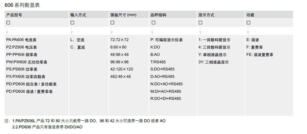Navigator new 606 series digital display electrical measuring instrument product is a new and upgraded intelligent product launched by the company, and there are 8 product types: current, voltage, frequency, power, power factor, reactive power, combination table, and multi-function meter; 6 panel sizes (mm): 72:72×72, 6:80×80, 48:96×48, 96:96×96, 42:120×120, 482:48×48; it can perfectly replace 2222 series digital display meter products. The instrument has a RS485 communication interface, and a variety of extended function modules are available to realize the "four remote" (remote control, telemetry, remote signal, and remote adjustment) functions, meeting the intelligent needs of customers.
