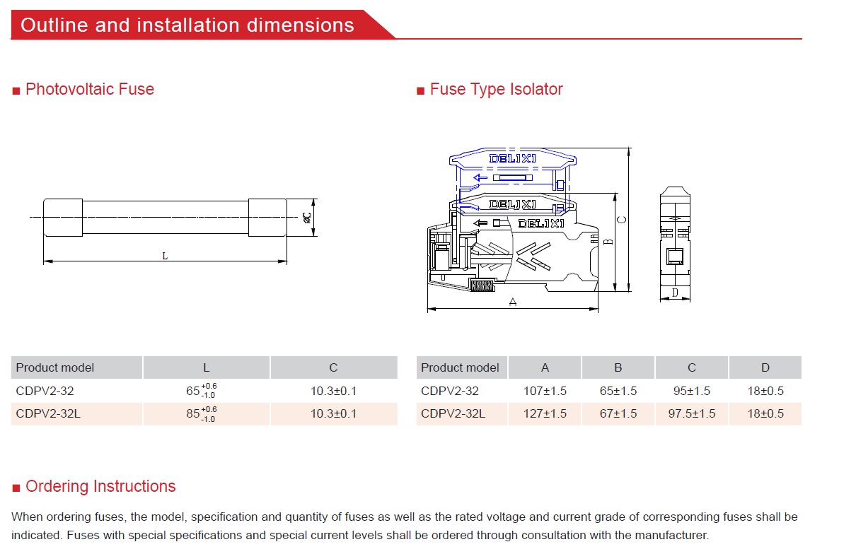 CDPV2-32(L) type solar photovoltaic system protection fuse is suitable for power distribution lines with a rated voltage not exceeding DC1500V, a rated current not exceeding 32A, and a rated short-circuit capacity not exceeding 33kA for short-circuit and overload protection It is mainly used in solar photovoltaic combiner boxes for short circuit and overload protection for solar photovoltaic power generation devices and other semiconductor equipment.