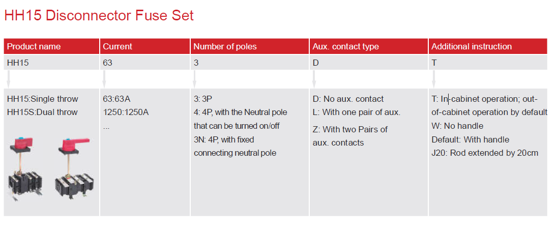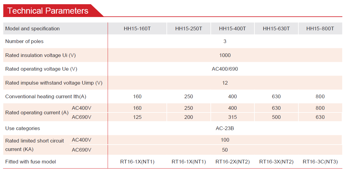 HH15-630T series disconnector fuse set is suitable for low-voltage power distribution system with a rated frequency 50Hz, a rated insulation voltage up to 1000V, a rated working voltage up to AC400V/690V, and a rated working current up to 630A as power switch, switch disconnector and emergency switch with short circuit and overload protection function for circuit protection.