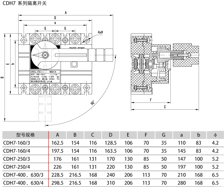 CDH7R series disconnector with a rated insulation voltage 800V, a rated frequency 50Hz, a rated working voltage up to AC400/690V, and a rated working current up to 630A is mainly used in power distribution circuits for power isolation.