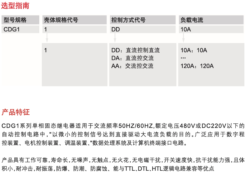 CDG1 single-phase solid state relay product is a novel contactless switch assembled and solidified by semiconductor components. The product has a series of advantages such as fast switching speed, high working frequency, long service life, low noise and reliable action, and non-sparking. It not only replaces electromechanical relays, but also is widely used in digital program control devices, motor control devices, temperature control devices, data processing systems and computer terminal interface circuits, especially suitable for special occasions with frequent actions, and explosion-proof, moisture-resistant and corrosion-resistant properties.