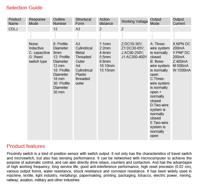 CDLJ series proximity switch is a position sensor with switching output. It not only has the characteristics of travel switch and micro switch, but also has sensing performance. It can directly drive relays, counters and contactors, and can also be connected to microcomputer networking to realize automatic control. The product is widely used in machine tools, metallurgy, chemical industry, textile and printing industries, and used in the automatic control system as limit, counting, positioning control and automatic protection links.