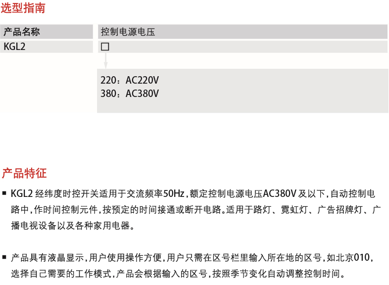KGL2 latitude and longitude time control switch is suitable for AC 50Hz automatic control circuit with a rated control power supply voltage AC380V and below as a time control element to connect or disconnect the circuit according to the predetermined time, suitable for street lights, neon lights, advertising sign lights, radio and television equipment and various household appliances.