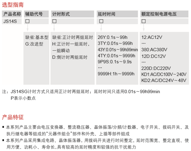 This series of products mainly consist of the "component combination" part composed of voltage converter, rectifier regulators, oscillators/ frequency divider /counters, electronic switch, DIP switch, and actuator relay, the shell, and the upper plug. This product adopts integrated circuit and crystal oscillator with the DIP switch used to time setting, featuring with wide delay range, intuitive setting, convenient operation, small power consumption, long service life, high delay accuracy and strong anti-interference ability.