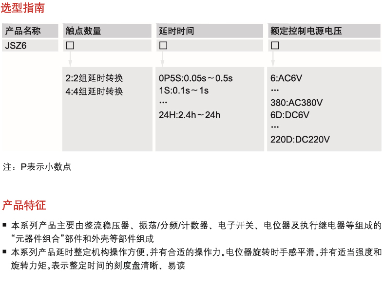This series of products mainly consist of the "component combination" part composed of voltage converter, rectifier regulators, oscillators/ frequency divider /counters, integrated circuit, potentiometer and actuator relay and the shell; This series product delay setting mechanism is easy to operate, and has appropriate operating force. Hands feel smooth when the potentiometer is rotating with appropriate strength and rotation moment, indicating that the setting time dial is clear and easy to read.