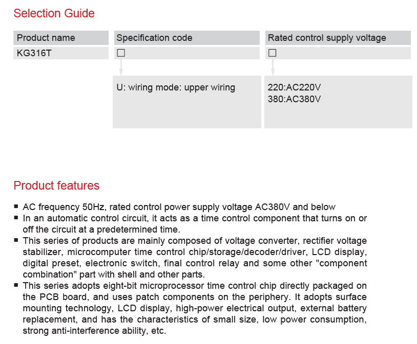 The time control switch KG316TU is used in the AC 50HZ automatic control circuit with rated control power supply voltage 380V and below as a time control element to turn on or off circuits according to the predetermined time; it is used for scheduled connection and disconnection control of street lights and advertising light boxes.