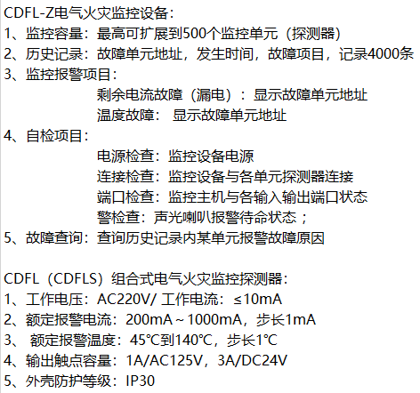 CDFL series electrical fire monitoring system is composed of a CDFL combined electrical fire detector, a CDFLS combined electrical fire detector, and a CDFL-Z electrical fire monitoring equipment (host) to receive residual current and temperature signals from field equipment to realize the alarm, monitoring, control and management of protected electrical lines. This system is suitable for intelligent buildings, high-rise apartments, hotels, restaurants, commercial buildings, industrial and mining enterprises, national key fire fighting units, petrochemical, cultural and educational health, finance, and telecommunications fields for remote metering, remote adjustment, remote control, and remote signaling of detectors scattered in the building to realize convenient monitoring and management.