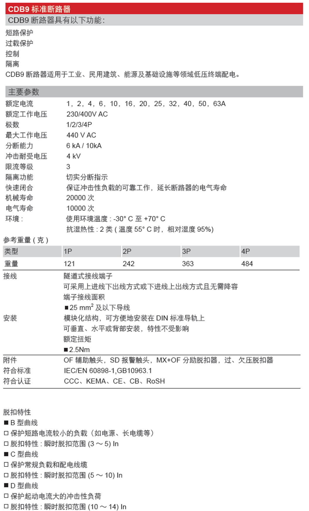 CDB9N, CDB9H miniature circuit breaker is suitable for AC 50HZ low voltage terminal power distribution system with a rated voltage 230V/400V and a rated current 1-63A. With short circuit protection, overload protection, and disconnection functions.