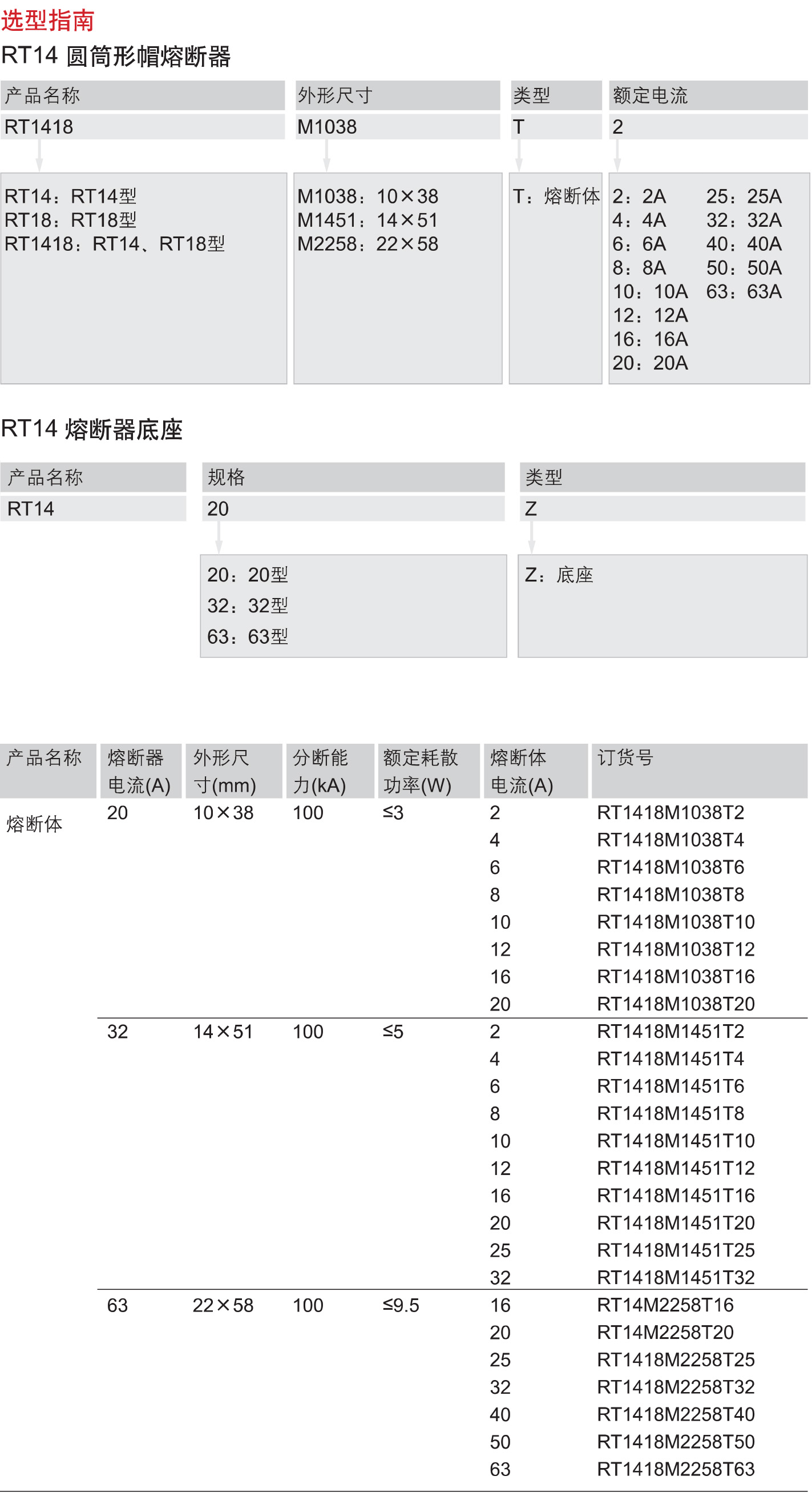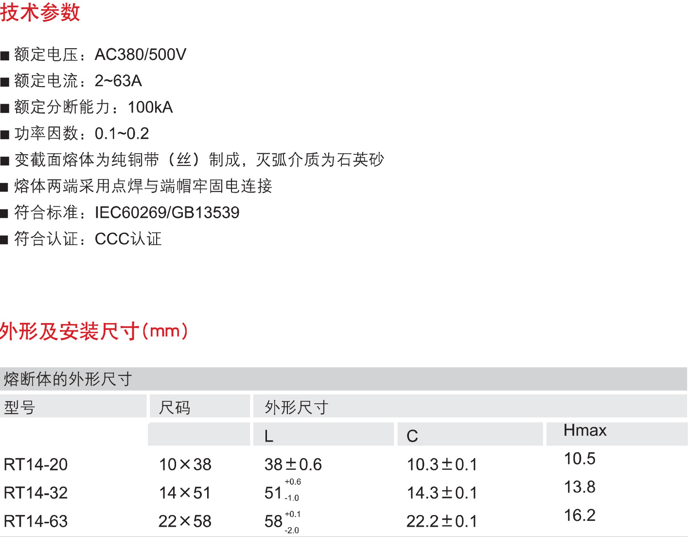 RT14 cylindrical cap fuse is suitable for AC 50Hz power distribution devices with a rated voltage up to 380V and a rated current up to 63A for overload and short circuit protection.