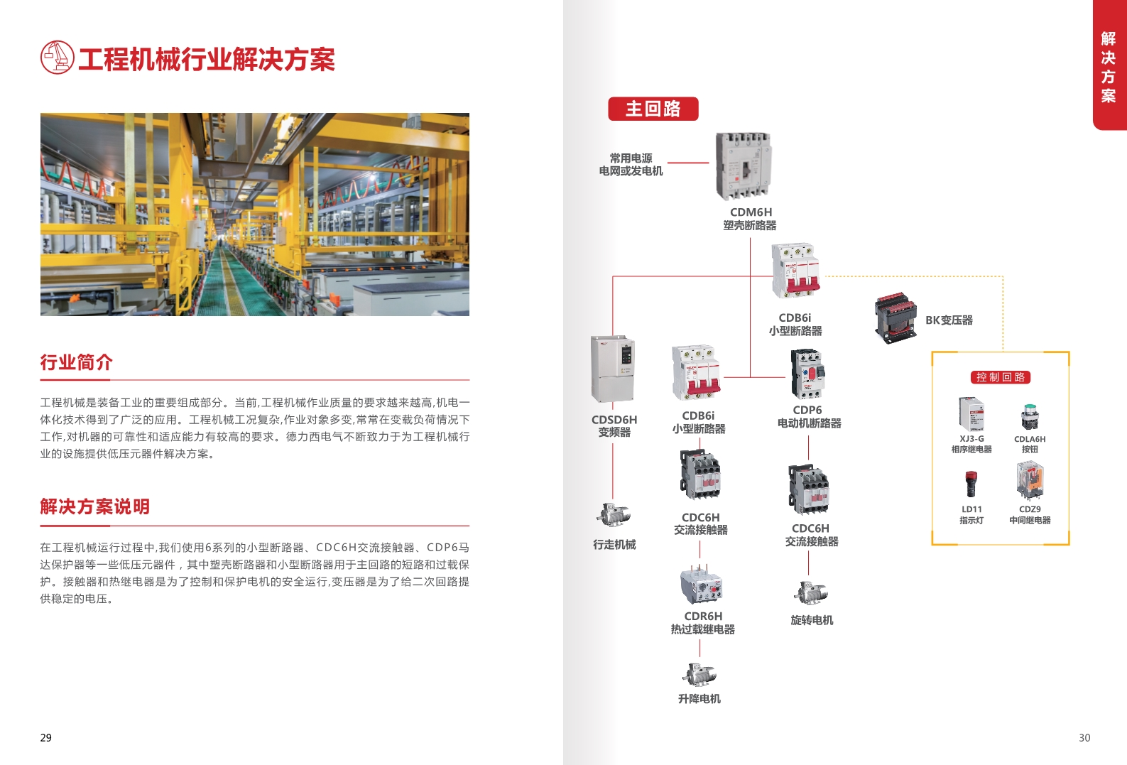 在工程機械運行過程中,我們使用6系列的小型斷路器、CDC6H交流接觸器、CDP6馬達保護器等一些低壓元器件,其中塑殼斷路器和小型斷路器用于主回路的短路和過載保護。接觸器和熱繼電器是為了控制和保護電機的安全運行,變壓器是為了給二次回路提供穩(wěn)定的電壓。