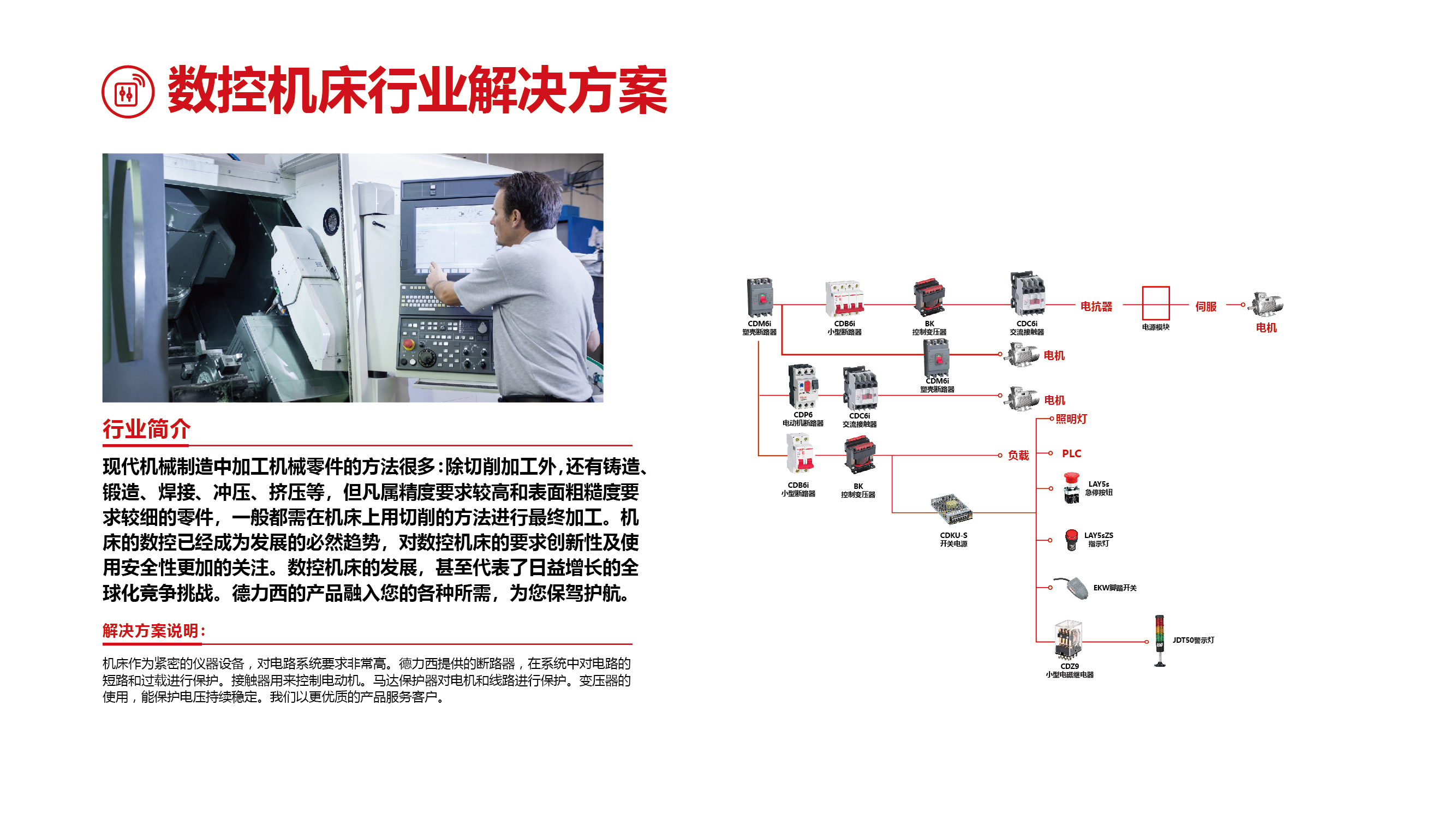 機床作為緊密的儀器設(shè)備,對電路系統(tǒng)要求非常高。德力西提供的斷路器,在系統(tǒng)中對電路的?短路和過載進行保護。接觸器用來控制電動機。馬達保護器對電機和線路進行保護。變壓器的使用,能保護電壓持續(xù)穩(wěn)定。我們以更優(yōu)質(zhì)的產(chǎn)品服務(wù)客戶。