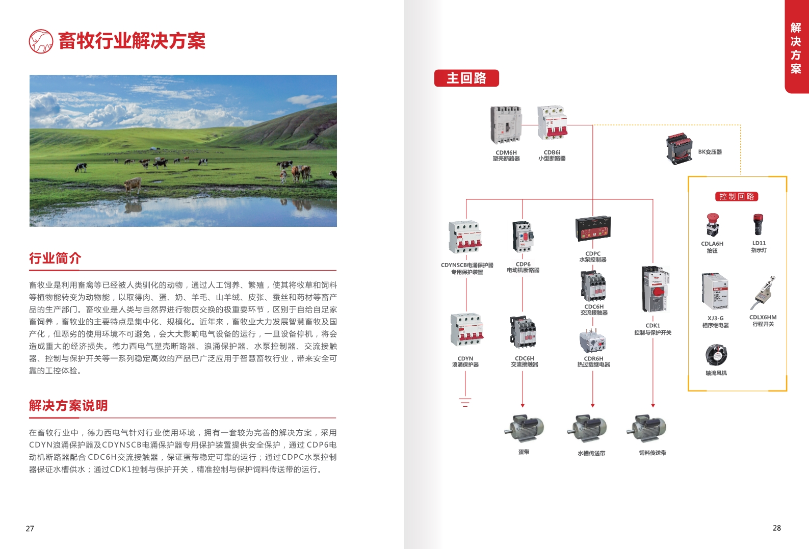在商牧行業(yè)中,德力西電氣針對行業(yè)使用環(huán)境,擁有一套較為完善的解決方案,采用CDYN浪涌保護器及CDYNSCB電涌保護器專用保護裝置提供安全保護﹐通過CDP6電動機斷路器配合CDC6H交流接觸器,保證蛋帶穩(wěn)定可靠的運行﹔通過CDPC水泵控制器保證水槽供水﹔通過CDK1控制與保護開關(guān)﹐結(jié)準控制與保護飼料傳送帶的運行。